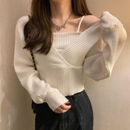 쪼예 [투피스] 여리여리 오프숄더 브이넥 루즈핏 풀오버 니트 나시 세트