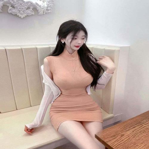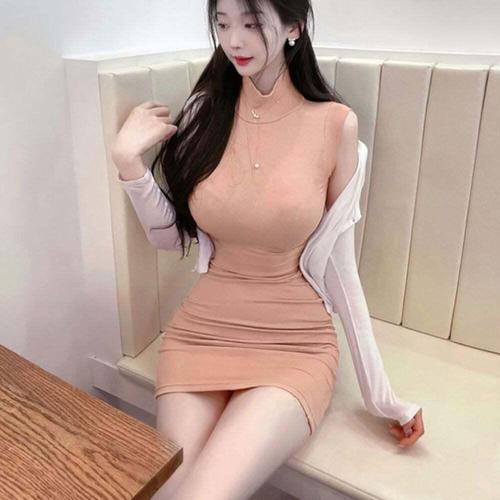 [셀럽하우스]여자 WCXK8337 H라인 민소매 목 폴라 스판 미니 짧은 원피스