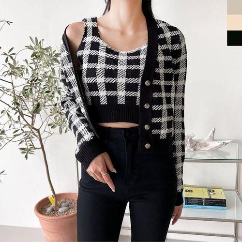 [에이치플러스몰]여자 하운드 체크 나시니트+ 가디건 세트