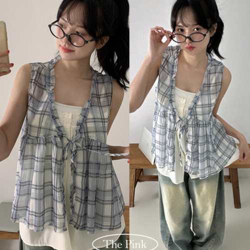 더핑크 / 히우 체크 프릴 레이어드 민소매 블라우스