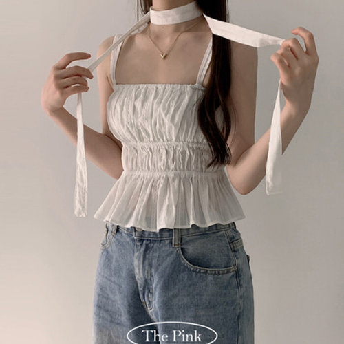 더핑크 / 다엘 펀칭 셔링 밴딩 나시 블라우스 + 타이 set