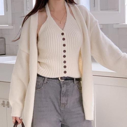 [다잇템][다잇템] 여자 빅사이즈 홀터네크 골지나시 카디건 단추 브이 세트_23584097_588872