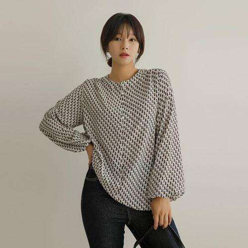 [엘리시아]고나 헨리넥 나염 버튼 블라우스