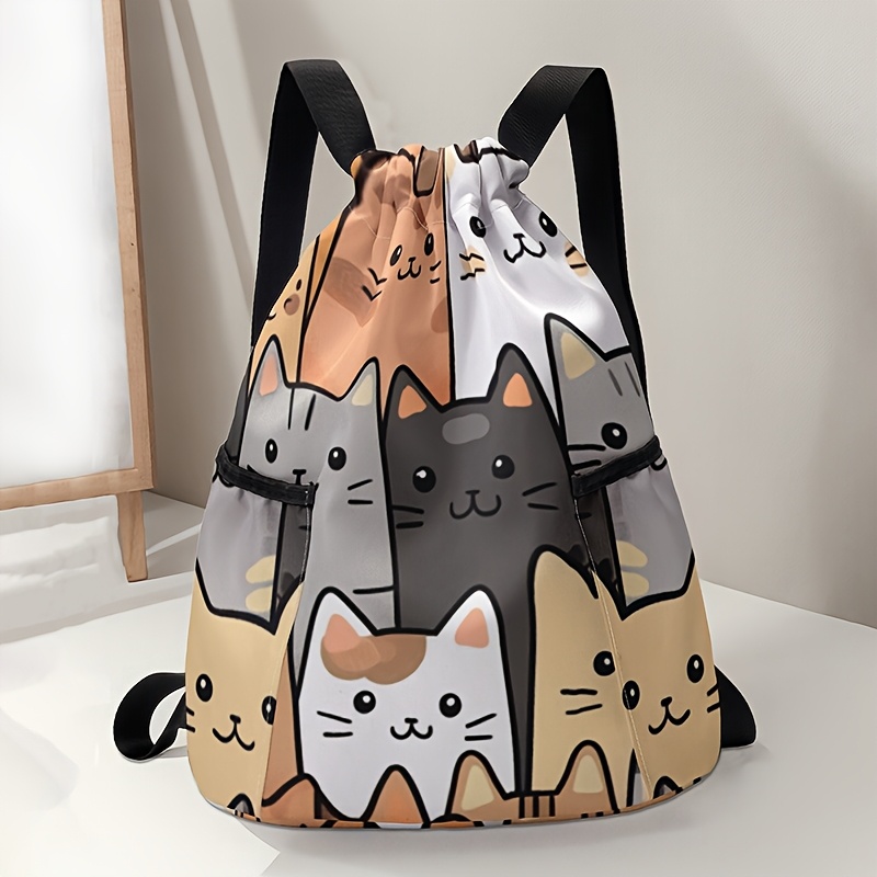 TEMU 귀여운 고양이 프린트 드로스트링 백팩 - 대용량 내구성 있는 체육관 가방, 조절 가능한 어깨끈, 스포츠 해변 백팩, 여행, 하이킹, 캠핑 - 남녀 공용 디자인, 하이킹 장비