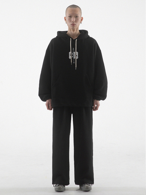[팬쇼] [논기모/기모] (셋업) 6:19 크로스 스트링 후드+팬츠 - 블랙