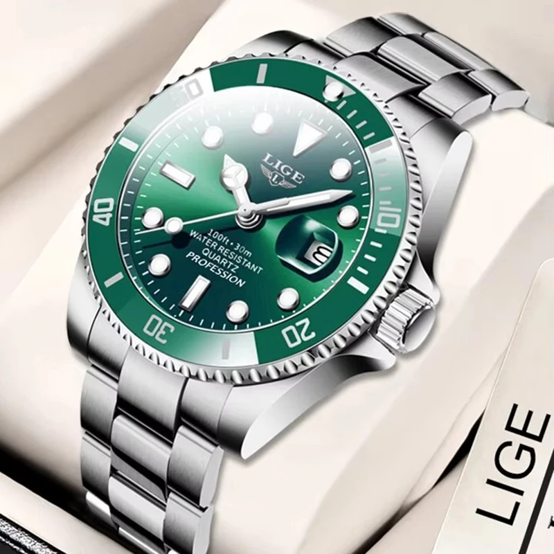 LIGE 최고급 명품 패션 다이버 시계 남성용 30ATM 방수 날짜 표시 스포츠 시계 남성용 쿼츠 손목시계 남성 시계
