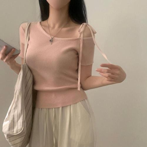브이넥티 골지니트 반팔탑 골지 숄더리본 티셔츠 WFKPD85