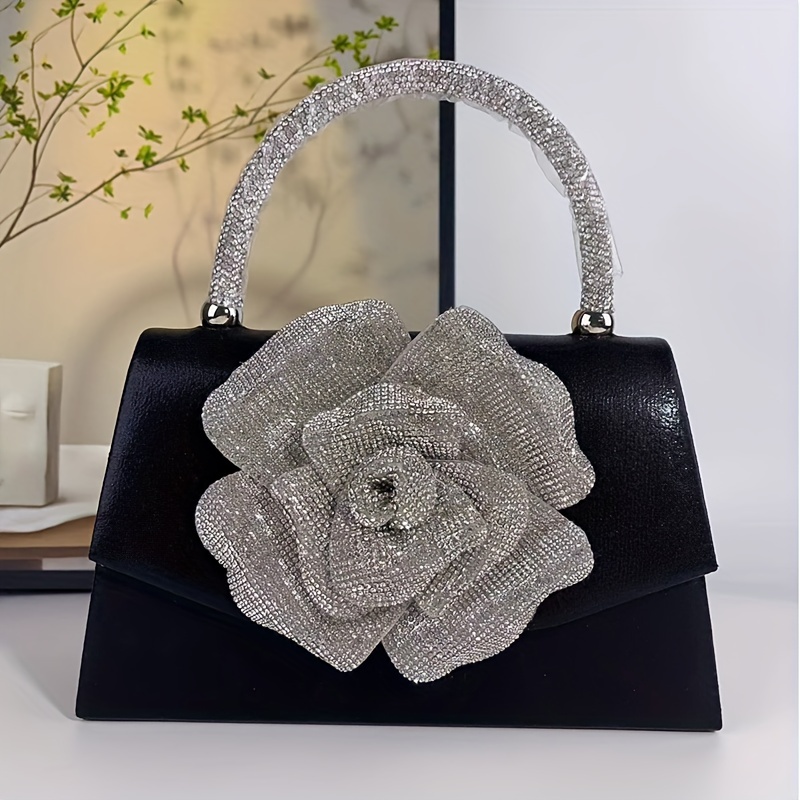 TEMU 유럽 및 미국 스타일 핸드헬드 드릴 백, 국경 간 라인스톤 장식 장미꽃, 슈퍼 인기 연회용 가방, 크로스바디 프렌치 스타일 가방