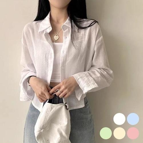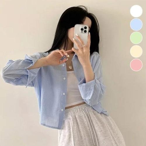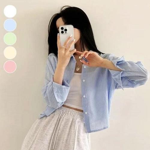 [HYIK1225_4B]여름 소재 반크롭 기장 잔스트라이프 셔츠