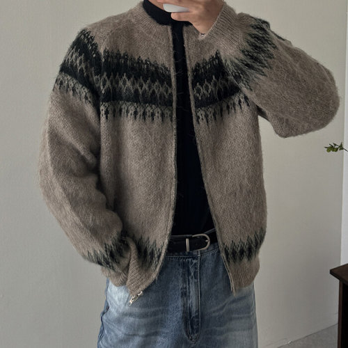 제로스샵 / 브러쉬무드/남친룩 세이즌 노르딕 다이아 텍스처 오버핏 니트 집업