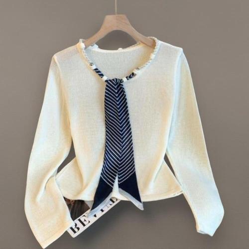 [신상오픈런]여성 스트라이프 스카프 넥타이 여리핏 롱슬리브 니트