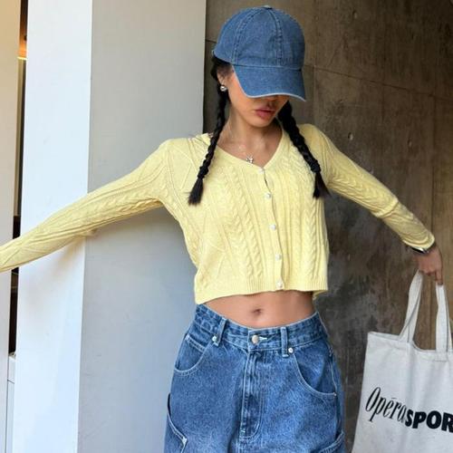 [옷자락] 여자 노란색니트 진주단추 꽈배기 브이넥 크롭 가디건