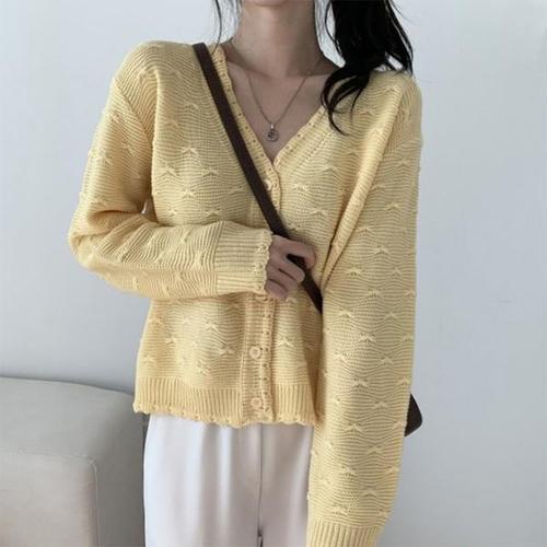 [신상오픈런]브이넥 봄가디건 노란색 여성 물결 그물니트 펀칭