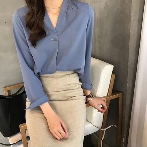 [셀러허브_여성트랜드패션]여자 블라우스 셔츠 노카라 깔끔한 오피스룩