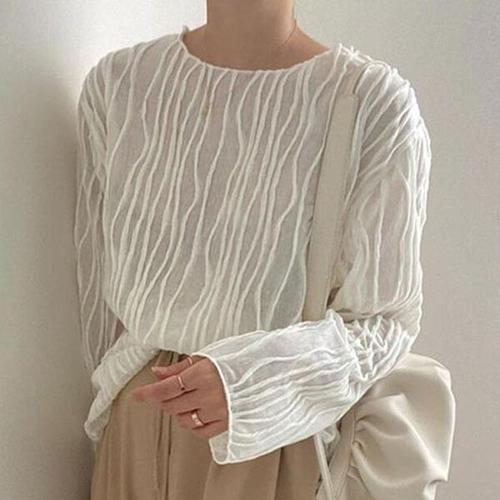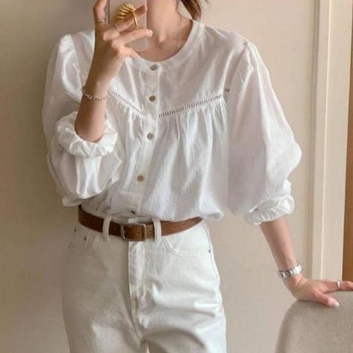 [셀러허브_여성트랜드패션]여자 루즈핏 펀칭 셔츠 블라우스 페미닌 노카라 긴팔