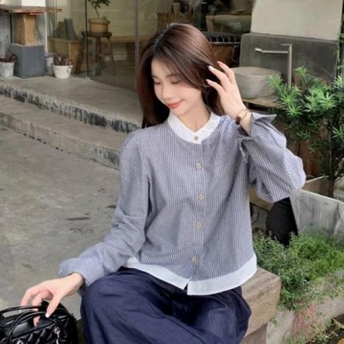 [신상오픈런]여자 클래식 배색 스트라이프 노카라긴팔 셔츠