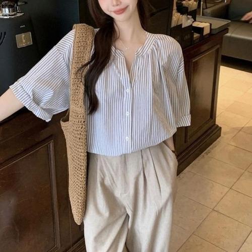 [셀러허브_여성트랜드패션]여자 셔츠 세로 스트라이프 노카라 오피스룩 블라우스