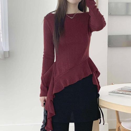 [다잇템]여자 슬림핏 프릴 언발 베이직 롱슬리브 니트
