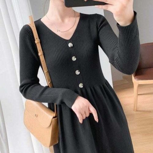 심플 브이넥 니트 원피스 플레어스커트 버튼장식