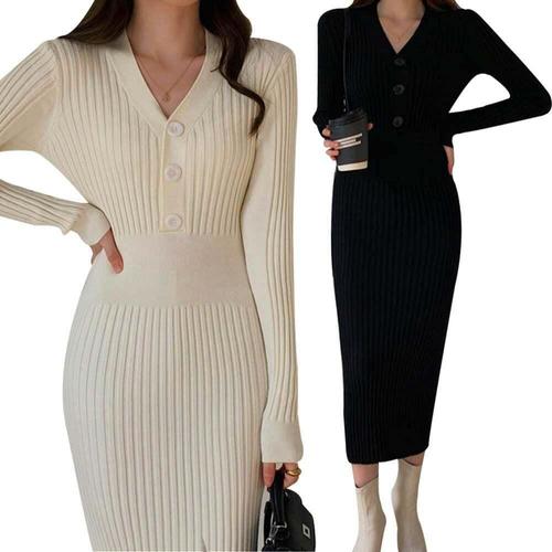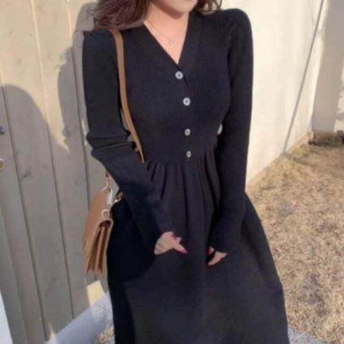 슬림소녀 여성 봄 가을 작은 키 단추 힙업 스커트 긴팔 심플 미니 니트 원피스