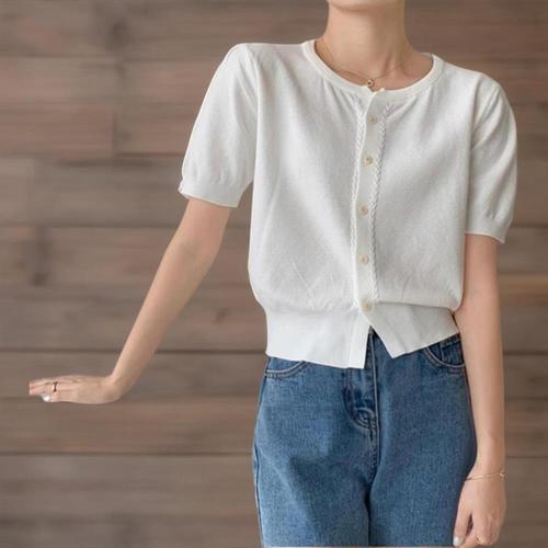 [신상오픈런]여성 라운드넥 반팔 니트 가디건 심플 단추 디자인