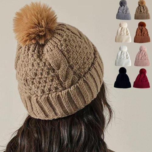 여성 겨울 방울 비니 꽈배기 니트 방한 퍼 안감 모자 WFFZJT0