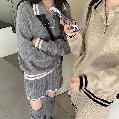 스커트 카라 니트 배색 플리츠 세트 깔끔 투피 WFKOJ4D