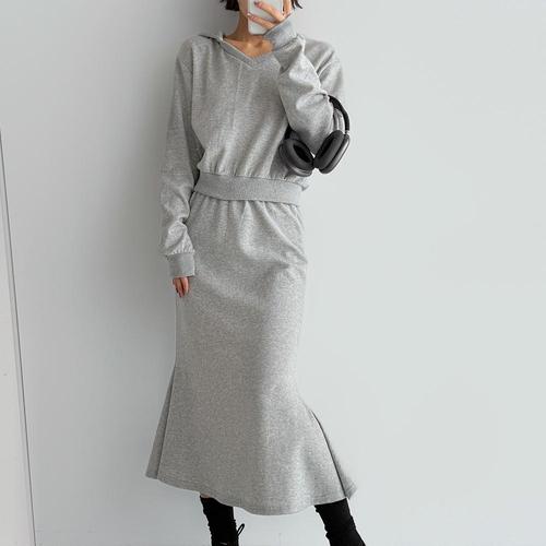 [옷자락] 여자 브이넥 크롭 후드티 머메이드 롱스커트 세트