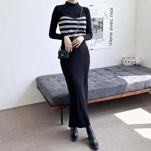 토시 니트웨어 패션 롱 드레스 의상 여성 루즈핏 커버업 V넥 골지 투피스 세트 파티룩 여성 니트 드레스 세트
