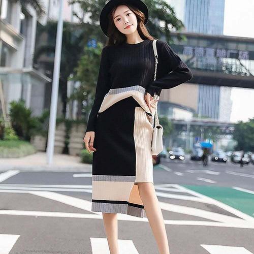 [셀럽하우스]간절기 OCMW7591 배색 라운드 니트 여성 스커트 옆트임 세트