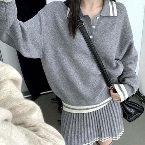 [셀럽하우스]배색 TUFS6669 니트 여성 셋업 플리츠 카라 세트 스커트