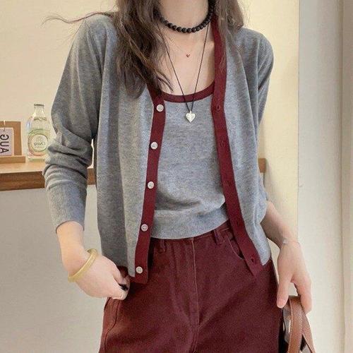 그레이 페이크 투피스 라운드넥 버튼 니트 가디건 여성 - 가을 신상 여성의류 코리안 스타일 스웨터 트렌디