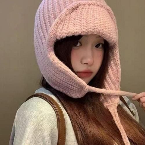 라핑 겨울 방한 울 꽈배기 니트 귀도리 턱 끈 여성 귀마개