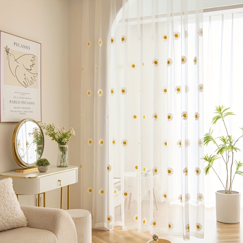 TEMU 1pc 매력적인 코티지 다이즈 시어 커튼 - 흰색 꽃 자수와 금색 액센트, 로드 포켓 디자인, 반투명 룸 디바이더, 거실 및 침실 장식용, 폴리에스터 원단, 거실 커튼