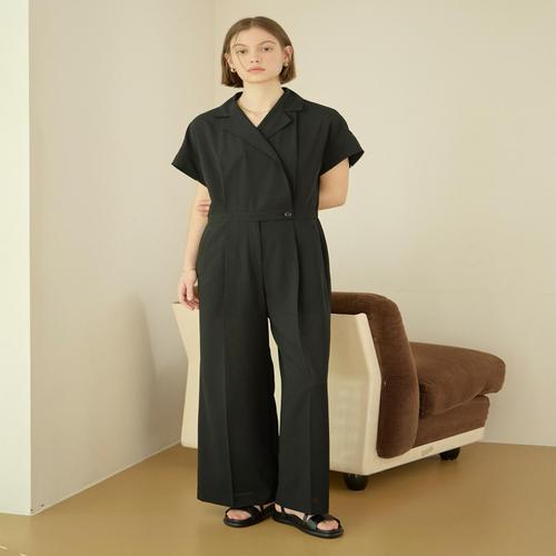 닥스 여성 블랙 핀턱 와이드핏 뒷밴딩 반소매 점프 수트 (DLDR5BI33BK)
