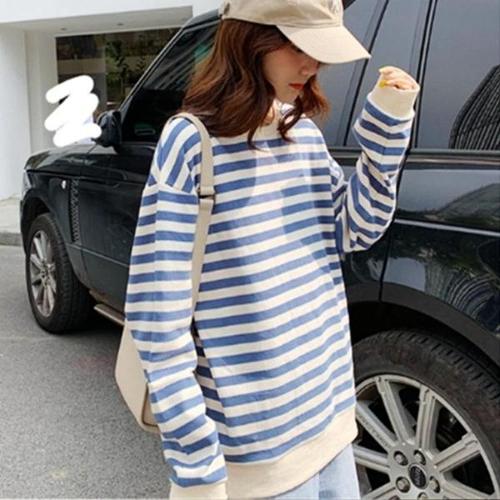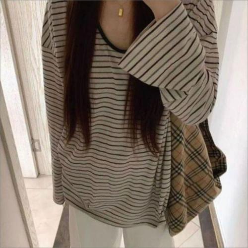 봄가을용 여성 긴팔 티셔츠 스트라이프 패턴 스타일리시 디자인 루즈핏 대형 사이즈 편안 착용 가능 클래식 레이어링 베이직 아이템