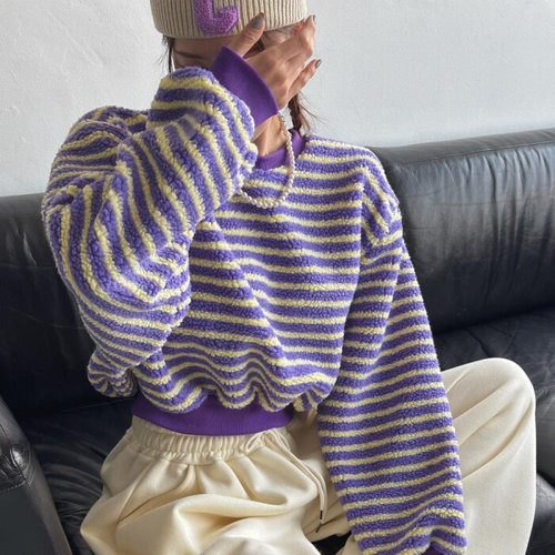 [옷자락] 여자 겨울 양기모 크롭티 퍼프 스트라이프 분홍 맨투맨