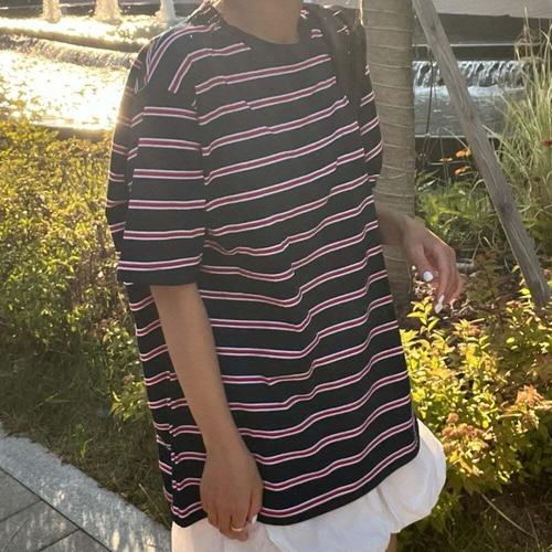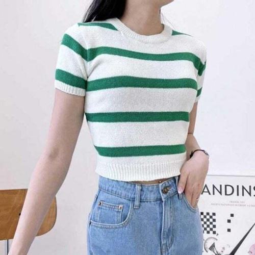 [셀럽하우스]스트라이프 JJOY5354 단가라 추천 패턴 라운드넥 반팔 니트웨어