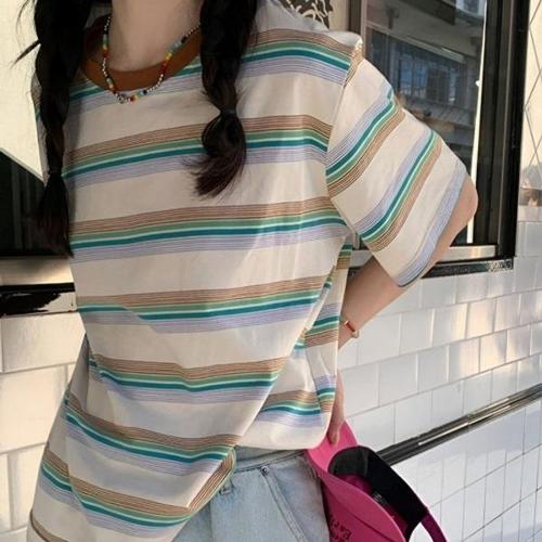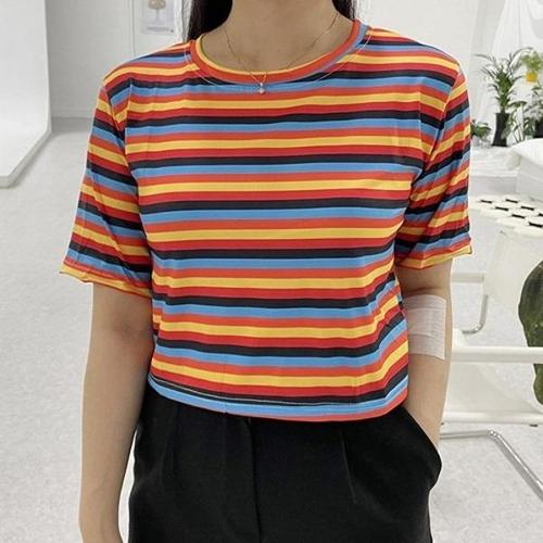 롱 여성 여름 스트라이프 반팔티 라운드 크롭티 WFLQAH5