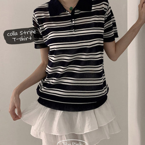 더핑크 / 시틴 카라 스트라이프 시스루 니트 반팔티