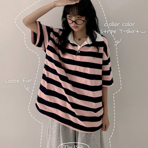 더핑크 / 먼드 루즈핏 카라 스트라이프 반팔티