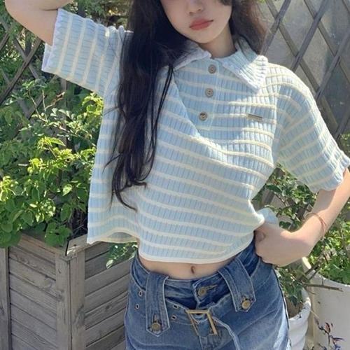 [엄지척]여자 배색 단가라 크롭 반팔 카라 니트 짧은 반팔티_19677595_667501