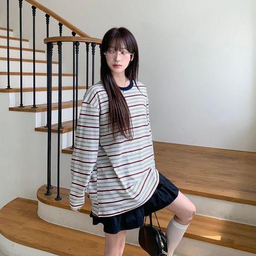 [옷자락] 여성 키치무드 배색 스트라이프 박스핏 라운드넥 반팔티