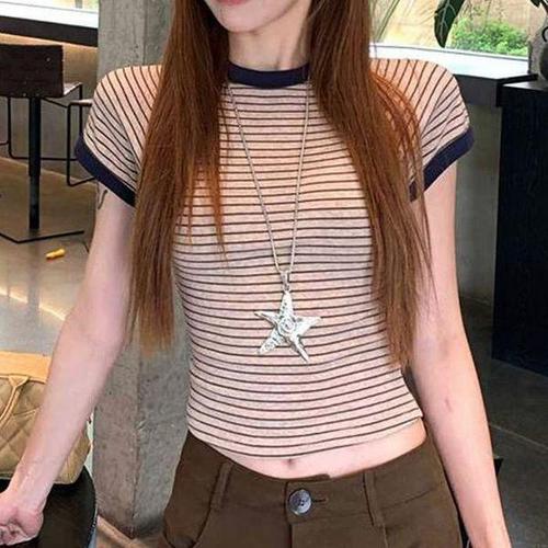 [셀러허브_여성트랜드패션]ONM 여름 크롭 스트라이프 반팔티 여성 캐주얼룩 티셔