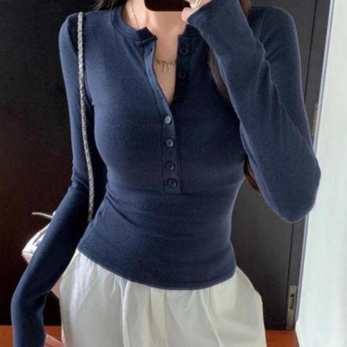 IBOY UGIRL XU0044C 여성 라운드넥 골지티 단추 포인트 사계절티 긴소매 슬림핏 딱붙 이너티
