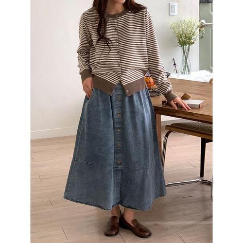 여자 투버튼 A라인 밴딩 청치마 면 롱스커트