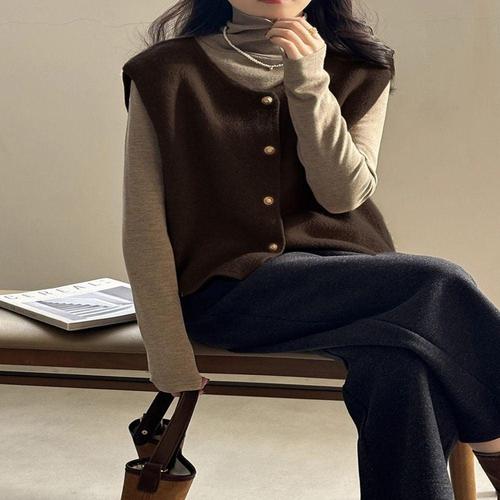 [다잇템]여성 베이직 금색 폴라넥 단추 스웨터 조끼