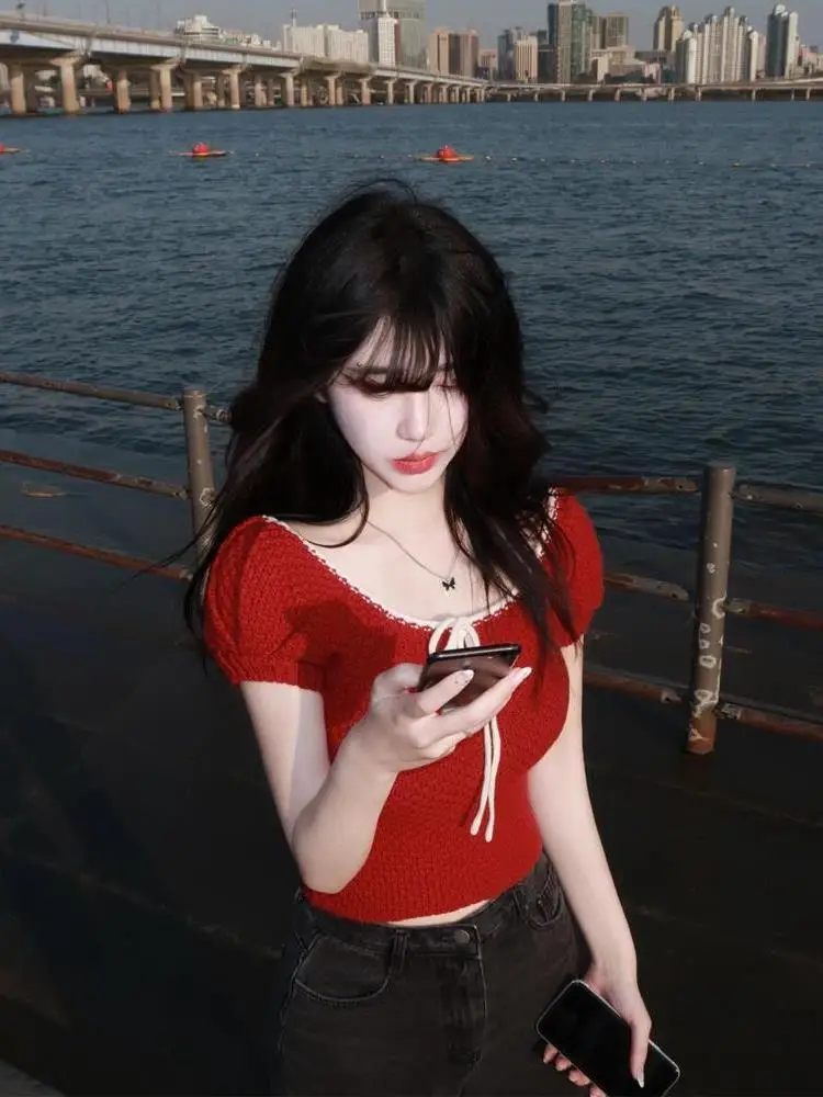 레트로 나비 매듭 레드 반팔 니트 스웨터 여성 여름 달콤하고 매운 질감의 짧은 버블 슬리브 탑