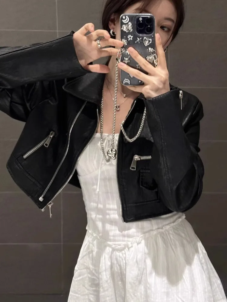 레트로 아메리칸 블랙 모터사이클 PU 가죽 재킷 숏 하이웨이스트 여성 스타일 달콤하고 매운 봄 가을 트렌디