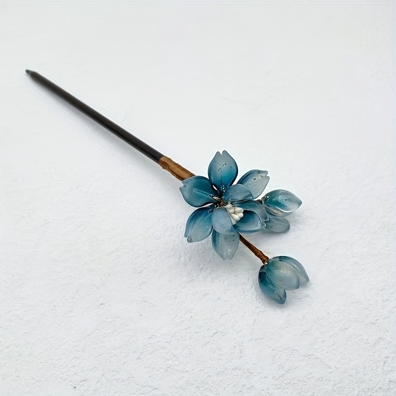 TEMU 파란색과 흰색 유리 꽃이 달린 전통적인 잉크 워시 스타일 머리핀, 데일리 업스타일에 적합